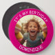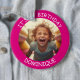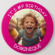 Anpassadets foto och namn - DET ÄR MIN BIRTHDAY - knapp. Shock rosa ram med vit text.