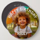 Anpassadets foto och namn födelsedagsknapp med ett vitt sött teckensnitt.