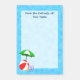 Anpassade Post-it-noteringar med rolig strand- eller poolinspirerad konst med en röd strandboll, grön solparasoll, sandaler och sololja på en blå vattenbakgrund.