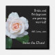 En söt "Spara datumet"-kylskåp som du kan använda för att anpassa, med en blek rosa rosenknopp, "New Dawn", på en svart bakgrund, från ett foto av Judy Adamson