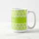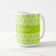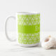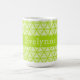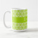 Kluster med tunna, ljusa, gröna vridningar i en triangel som mönster täcker detta ljusa mugg, med en solid grönt mittremsor för anpassadets text