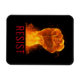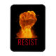 Den lagtematiska magneten i social har en stor del av eld och lågor med anpassadet "RESIST" i rött modernt teckensnitt på svart bakgrund.