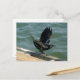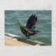 En svart kråka sprider sitt vingar som en förberedelse för flyget från kant i en fiskehamn nära Galveston, Tx