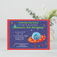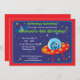 Denna roliga födelsedagsfest inbjudan presenterar en främling i en utrymmefrakt och en utrymmestation på en blåttrymdenbakgrund med stjärnor. Fullständigt anpassade.