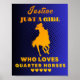 Den här poster är perfekt för alla flickor som har passion för hästar! Med ett dynamiskt blått och orange färg-program har det ett lekfullt och roligt-vänligt budskap "Bara en flicka som Kärlek Quarter Horses" i fetstil och snyggt brev. Utformningen omfattar också en silhuett av en häst, som betonar temat och lägger till en inslag av visuellt intresse. Dessutom kan den här poster vara personlig med ett namn, skapar det ett verkligt unikt och speciellt tillägg till vilket sovrum eller bostadsområde som helst. Vare sig du är en säsongsbetonad riddare eller bara kärlek är hästens nåd och skönhet, så kommer den här poster att ge ett litet personlighetsmått och charm till vilket rum som helst.