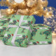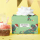 Gör Julklapp ännu mer speciellt med den här personligens presentfigursättning, med en tecknad T-Rex som bär en julhatt och trasslat in sig i julklapp ljus mot ljust grönt bakgrund. En bubbla i tecknad tal innehåller ord "God jul" och ditt barns namn.