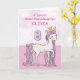 En söt rosa ponny precis som din farmorsdotterdotter dansar med siffran åtta! Guldliknande detaljer är invävda i hennes man och svans. Perfekt kort för att önska din farmorsdotterdotter en lycklig 8-årsdag! Personifiera detta kort med din farmorsdotterdotters namn.