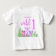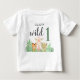 Denna bebis-flicka t-shirt är dekorerad med handritade akvarell-djungeldjur, giraff, tiger och lejon omgivna av tropiska blad i nyanser av lila, rosa och grönt.