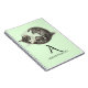 Skadade upp sovkattillustration med anpassningsbar initial och namn. Blekens grönt - bakgrund. En söt bärbar dator eller journal för ett litet barn.