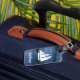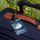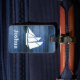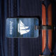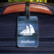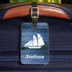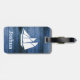 Havsblått trä och vitt bagagetagg för segelbåtar med personlig namn i vitt.
