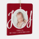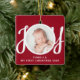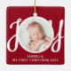Den här söta Baby första julfoto Ornament dekoreras med ord JOY i snyggt skripttypografi på röd bakgrund. Anpassade enkelt med ditt foto, namn och år.
