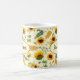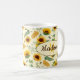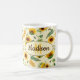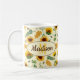 Anpassade namn och monogram mugg med färgade trädgårdsblommor och honungsbin, gult och grönt färg.