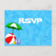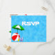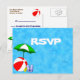 En anpassningsbar mall för svar på strand- eller poolparty med strandboll och parasoll på ena sidan och utrymme för din returadress och gästinformation på baksidan i roliga bokstäver. Anpassa den för att ändra typsnitt, storlek och mer, spara även din design för senare.