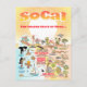 Färgglad vy över södra Kalifornien - tokiga figurer härjar på stranden och i öknen i SoCal med Los Angeles, Orange County, Santa Barbara, San Diego, Riverside, Palm Springs, Anza Borrego och Joshua Tree nationalparker - liksom gränsstäderna Tijuana, Tecate och Mexicali. Denna SoCal-karta har allt - en surfare hänger i luften, en späckhuggare hoppar upp ur vattnet, djur i djurparken hälsar turister välkomna, ett par leker i bränningarna medan en T-Rex rytande utmanar och en stridsvagn rullar in i position och mycket mer…