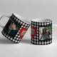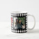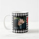 Personlig modern kaffe mugg med dina två foton och ett rött hjärta med trägraverat monogram initialer och text över en svart och vit gingham plaid mönster. Cute Valentine Day keepsakpresenter för pojkvän eller flickvän, par-dejtingsårsdag, bröllop eller förlovning.