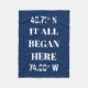 Ett vackert sätt att komma ihåg var allt började genom att anpassa den här designen med dina egna koordinater. Sök efter koordinaterna på en mappningsplats och anpassa texten, latituden och longituderna för att skapa din egen personlig. Ett varmt marint blått färg i bakgrunden skapar det idealiskt för vilken hemskår som helst.