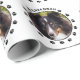 Desteis anpassningsbara fotomalldesign för sällskapsdjur som innehåller en del hund på kant och ett anpassningsbara textområde överst. Fotot placeras i mitten i rund form tillsammans med ett tunt svart gräns. Du kan ändra färg i tass avtryck och texten till vilket annat färg som helst, om du vill.