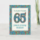 Ett ålderspecifikt födelsedagskort för en sextiofem-åring som ska anpassas, med nummer 65 och gräns fyllt med ett färgstarkt blommönster på tealbakgrund. Blommönstret är en del av "Granny Print"-samlingen Posh & Painterly, från en handmålad papper kollage av Judy Adamson. Den här designen passar alla storlekar på gratulationskort.