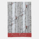 I den moderna kökshandduken finns handdragna björkfåglar i träd med röda kardinalfåglar inhägnade på grenar i svart bläck, med skuggning gjord i kor-hatch stil, mot en mycket ljusblå elegant. Anpassa med din favorit Julhälsningar, namn eller Familj namn.