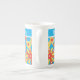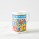 Bone China Mugg för att anpassa gula blommor till en ljusstark turkosbakgrund, med ett över mönster av rött, med en över hela orange, från ett handmålat pappert kollage av Judy Adamson.