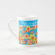 Bone China Mugg för att anpassa gula blommor till en ljusstark turkosbakgrund, med ett över mönster av rött, med en över hela orange, från ett handmålat pappert kollage av Judy Adamson.