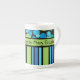 En chic Bone-China Coffee Mugg som ska anpassa sig, med en kantig "Blue Måne mönster i ljusblå blues och neon grönt på svart bakgrund, som har ett samordnat rullstolsremsat mönster. En del av Posh & Painterly 'Blue Måne Samling; från en handmålad papper kollageutformning av Judy Adamson.