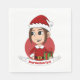 Napkins med en illustration av en söt, leende lycklig-flicka med långt brunt hår, hon bär röd och vit Jultomten kostym och håller en present; med redigerbar textmall för ditt namn eller meddelande, juldesign med röd helgdagar