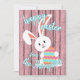 Söt, trendig och den moderna "Glad påsk" Vår-säsongen vill ha en lätt färgad av rustik åkermark i vår, träplåt i stil och en söt, leende kanin med färgstarkt rosa. Med utrymme att anpassa eller anpassa med din familj namn och den text du väljer på framsidan, och ett hjärtligt dikt-meddelande och personligt namn på baksidan som lätt kan anpassas till din egen hälsning-text eller personlig.