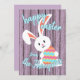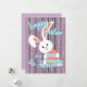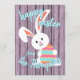 Söt, trendig och den moderna "Glad påsk" Vår-säsongen vill ha en lätt vår lavender violet periwinkle färgad rustik jordbrukshus, träplåt med stil bakgrund och en söt leende kanin med färgstarkt påskägg. Med utrymme att anpassa eller anpassa med din familj namn och den text du väljer på framsidan, och ett hjärtligt dikt-meddelande och personligt namn på baksidan som lätt kan anpassas till din egen hälsning-text eller personlig.