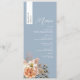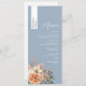 Höj mottagningen med den här personlig-menyn bröllop, med elegant och dammig blå bakgrund, mjuk persikofärgad blommigt och en namn som är tryckt på en lodrät remsa - perfekt för att kombinera en meny med ett platskort. Idealisk för vår, sommar, boho eller bröllop, ger den här menyn anpassningsbar en polerad, samordnad beröring till dina bord-inställningar. Matchar perfekt med fullt Dusty Blue och Peach Blommigt Bröllop Suite.