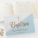 Anpassa den här eleganten Baptism gäst bok med ditt baby namn, Baptism-datum och inkludera en dubbelversa på baksidan.Med en guld kor-utskrift och modern blå diagonal. En vacker keepy från baby välsignad dag.