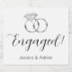 De här anpassningsbarna med vin-etiketter säger Engaged! tillsammans med ett par av silver-banderat vit diamant förlovning ringar, och bruden och groomerna namn. Perfekt för en förlovningsfest!