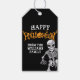 Den årliga märkrn Halloween fest-presenten för coola-anpassningsbarna som har ett läskigt skelett som hänger över orange och svart text och fantastisk-Jack o lantern. Anpassa de här favorittaggarna med din stora basinformation för alla dina gäster.