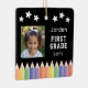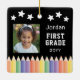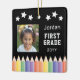 Med ditt barns foto omgiven av lekfulla färgpennor, innefattar den här vibrerande designen namn, år och klass för en roligt, personlig beröring. En perfekt vill gärna minnas tidigt skoldagar och en tänkbar gåva till föräldrar och mor- och farföräldrar. Fira din lilla inlärare med vår första färgstarka fotoKeepsaké Metall Ornament i Klass Back to school! Utformning av Ana Garza/Kardz Studio-design. Mallbilden är generativ innehåll. Om du har några frågor, kontakta mig genom Zazzle- chattan.