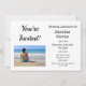 Gör en födelsedag till roligt tillfälle med den här roligten och en liten födelsedagsfotoinbjudan. Anpassa den och skicka ut den till ditt stora firande. Orden "Du är inbjuden" och party-uppgifterna är i svart typografi. Du kan ändra ut fotot med ett eget foto om du vill. Anpassadet är helt och hållet och färg kan ändras via redigeringsmenyn. Baksidan av inbjudan har ett vackert grått geometriskt mönster med cirklar.
