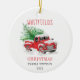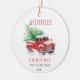 En klassisk röd lastbil i snö med Julgran på baksidan för att få det som är kom över helgdag.