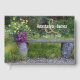 Bröllop gäst bok, fram och bak, är designad med ett foto av en rustisk bänk med en blomkruka av lila och gula blommor. Fyll i fält i mallen för eventuell gäst-bok-händelse som krävs. Ta bort texten eller klicka på anpassa om du vill markera det teckensnitt färg, stil och storleka som du föredrar.