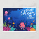 Fira World Oceans Day med detta pulserande och roligt undervattensblåst vykort, med färgstarka havslevande varelser som bläckfisk, maneter, korallrev och tropiska fiskar. Den djupa blåhavsscenen fångar det marina livets skönhet och mångfald, skapar den perfekt för miljömedvetande kampanj, klassrumsaktiviteter eller miljömedvetna utskick. Datumet den 8 juni 2023 är redigerbart, och detta vykort är idealiskt för lärare, konservativa eller alla som är passionerade över havsskyddet. Använda det för att sprida medvetandet, andra inbjudan till ett evenemang eller helt enkelt kärlek för havet. Ett underbart val för marinlivets entusiaster, hållbarhetsförespråkare och havets älskare i alla åldrar.