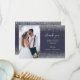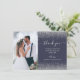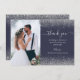 Anpassa det här tackkortet för elegant bröllop med lodrät bröllop-fotot till lämnat. "Tack" för ord visas på den lämnat i ett vitt handskriftsskript med blommor i början och slutet. Lägg till ett valfritt meddelande i blek silver grått kursiv text på mörk blått bakgrund med silver faux glitter gräns. Lägg till ditt första datum namn och bröllop på motsatt sida över ett blått tecken.
