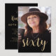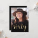 På framsidan av den här 60:e födelsedagsinbjudan finns den hederlige gästen med en textövertäckning av guld-färgaden. Ord "sextio" visas i kalligrafiskriptet elegant guld-färgad. Med en mörk skärm kan du göra så att texten visas. Anpassa den omvända sidan med informationen om namn och party på en svart bakgrund. Ett underbart sätt att fira någon som vrider sextio!
