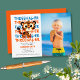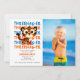 Threager födelsedagsfest inbjudan med ett anpassningsbar foto för att fira en liten pojkes 3-årsdag. Modern design med orange och blått färg för ett barn party. Alternativet Blått bakåt är tillgängligt på samlingssidan.
