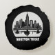 En minsta svartvit illustration av Houston-skylten med flera höga skyscraper och en silhuett av en park under. Den totala sammansättningen är ren och modern, med fokus på stadens koniska arkitektur.