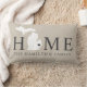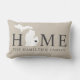 Snyggtens välkomstkudde har en typografisk design med "Home" och Michigan State karta. Den mjuka svarta / onyx-hjärtstadsmarkören kan placeras över den stad där du bor via Anpassa. Anpassa med ditt familjemonogram eller din hemstad namn. Beige, mjukt svart och vitt färg. Ett mönster i vågrät rand ligger i kuddens bakkant.