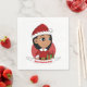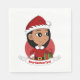 Napkins med en illustration av en söt, leende lycklig-flicka med långt svart hår, hon bär röd och vit Jultomten-dräkt och håller en present; med redigerbar textmall för ditt namn eller meddelande, juldesign med röd helgdagar