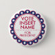 Oavsett om du kämpar för att leda land, din stad, din skola, ditt arbete eller om du stöder din favoritkandidat på ett oberoende sätt, kommer den här öga-fångstknappen att bli märkbar. Anpassa den här kommandoknappen enkelt med en egen namn och rubrik eller annan anpassningsbar. Den här designen har röd, vit och blå färg med en cirkel av vita stjärnor. (Tips! För en kandidattitel för två ord, t.ex. "Vice President", kan du ändra "För" till "Vice" i ord.) Ingen minsta orderkvantitet och ingen installationsavgift.