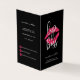 Med mappade kort i chicen kan du din kontaktinformation, dina programinstruktioner och tips och tricks, utan att behöva trassla med extra-kort! Utformningen har en färg-palett i chic med skarp svart, vit och magenta rosa, accentuerad med ljusa rosa läppillustrationer och "läppande chef" på framsidan. Den fyrsidiga designen är förtryckt med programtips och ytterligare tips och tricks på insidan och din affärsinformation, dina kontakter och dina medieprofiler i social på framsidan och baksidan. Anpassa den befintliga texten eller lämnan i befintligt skick.
