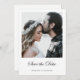 Den här platta bröllop spara datum-fotokortmallen med chic har en slående, minimalistisk och modern design. Bläddra i vår butik efter en version av den här designen med Spara datumtexten i guld och även i vykortsformat! Framsidan innehåller ditt första namn under ditt favoritfoto och ett "spara datumet"-meddelande som förmedlas i ett elegant, kursivt handskriftsskript. Dess blomning och flöde accentueras av "mindre är mer" estetiskt av denna design. Det här sparar datumdesignen inslag på båda sidor och kan inte ändras, men du kan välja att ta bort den på baksidan för att få ett ännu enklare utseende. Och på baksidan kan du naturligtvis, förutom att ersätta vår exempelinformation med din egen, ta bort fält som du inte behöver, eller ändra ordalydelsen, samt ändra teckensnitt, storlekt och färg. Du kan t.ex. ändra 'ARE GIFTA SIG' till 'ARE GIFTER SIG' eller något annat, eller ta bort exempelwebbplatsinformationen utan att ersätta den med din egen webbplatsinformation, eller så kan du ersätta den med ett helt annat meddelande. När du redigerar för ditt eget första namn på baksidan kan du också välja att inkludera dina efternamn. Standardvärdet för färg på namnen på framsidan är svart och standardvärdet för färger på baksidan är svart och något mjukt svart. Standardbakgrundsbilden färg på båda sidor är lika genomskinlig, så att pappra färg helt enkelt blir som baston. Men du kan redigera detta och ändra den ena eller båda sidans utseende i detta avseende också för kostym i stil. Anpassa den här eleganten moderna, minimalistiska bröllop spara datum-platta kortmallen med ditt foto och din inspiration och gör den unik för dig!