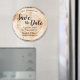 Anpassa dessa unika magneter i bröllop spara datum-cirkeln. Den har en tryckt skiva med träkornskläder, perfekt för bröllop som är naturligt, fallande eller botaniskt. Anpassa den här redigerbara mallen med bröllop-datum, plats, fullt (brud och groom) för det kommande bröllop. Grattisar på förlovningen från LDDESIGNLOFT.COM