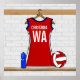 En unik design för netbollspelaren eller netbollen fläkt med en netbolluniform som hänger upp i ett rum som byter plats i rött med blå och vit trim. Du kan anpassa läget namn och netboll till netbollspelaren. En netboll och vattenflaska står bredvid nätbollsuniformen. Den här personligen kan skapas i vilken färg-kombination som helst för netbollsstjärnan i din familj. Kontakta oss via vår GiftsBonanaza-butik med din begäran. sgb01