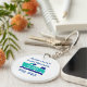 Anpassningsbar nyckelring med båtmotiv och grafik av en turkos och blå motorbåt, på framsidan. Anpassa texten efter dina behov för uthyrning av båtar.